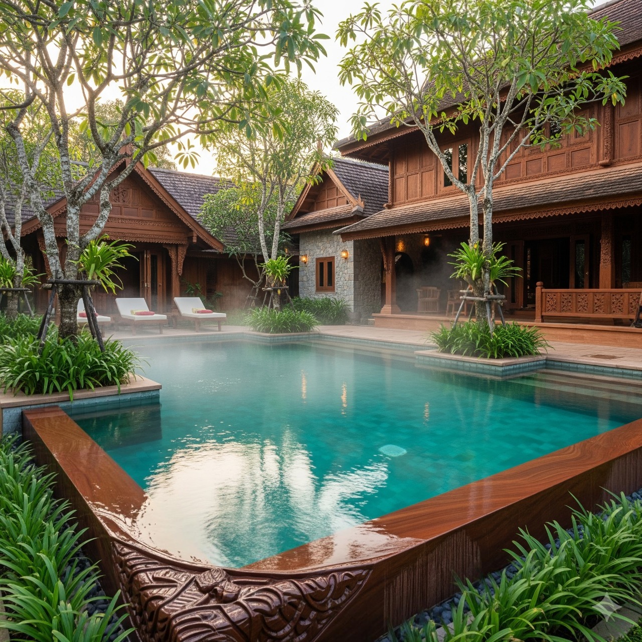 This exquisite sandalwood farmhouse boasts a tranquil swimming pool, offering a refreshing escape with its elegant design and calming ambiance