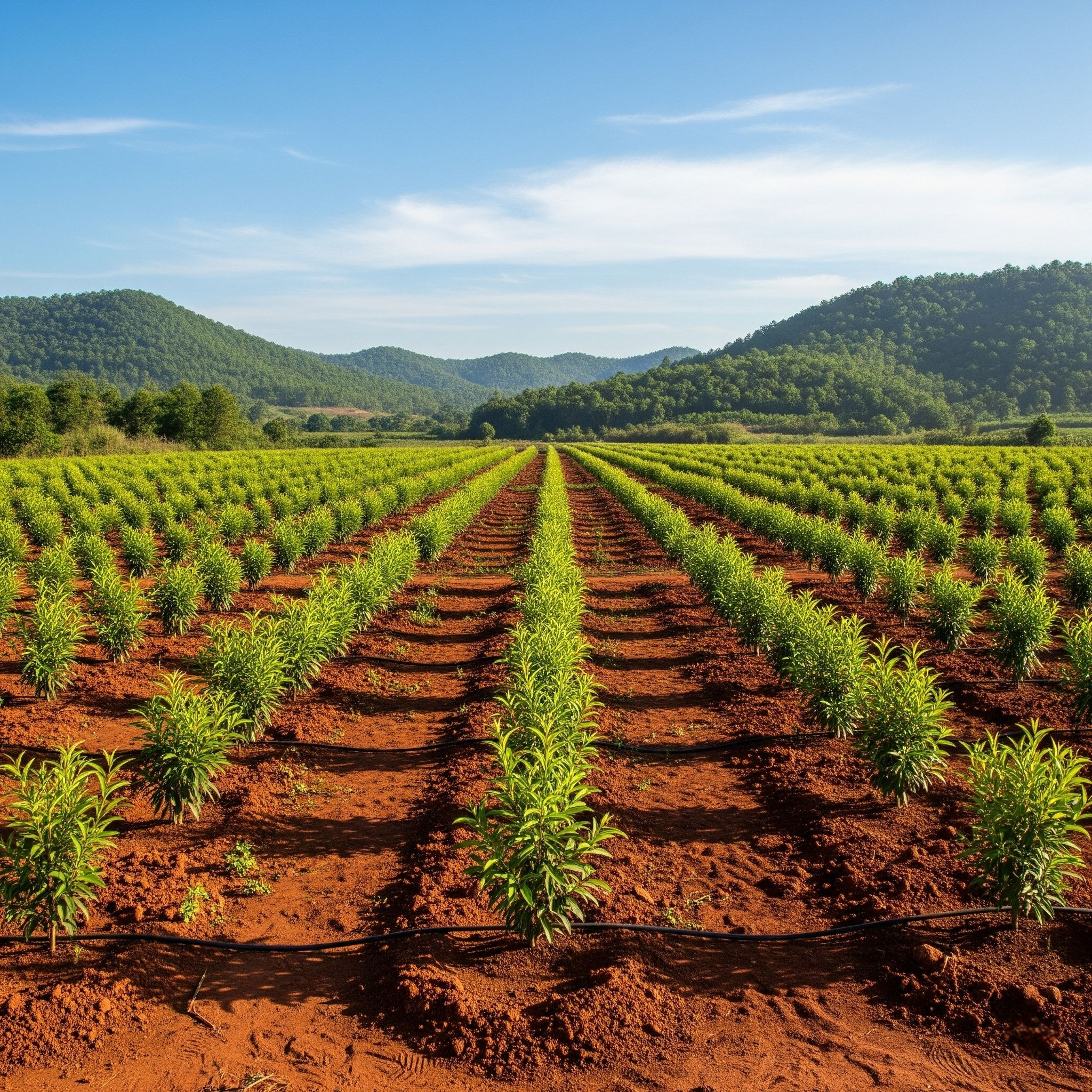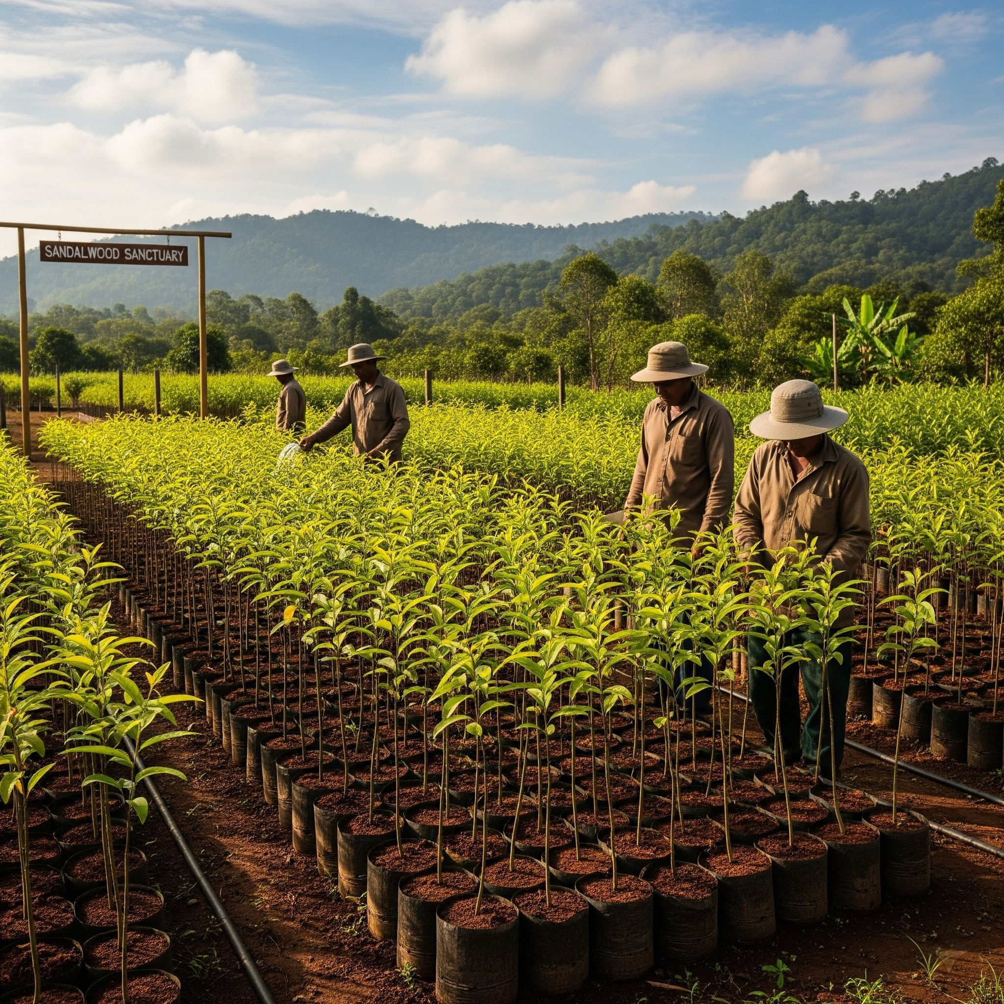 These meticulously arranged plots are the foundation of a sustainable sandalwood farm, where each sapling is carefully cultivated to yield the fragrant wood that will one day be a valuable commodity.